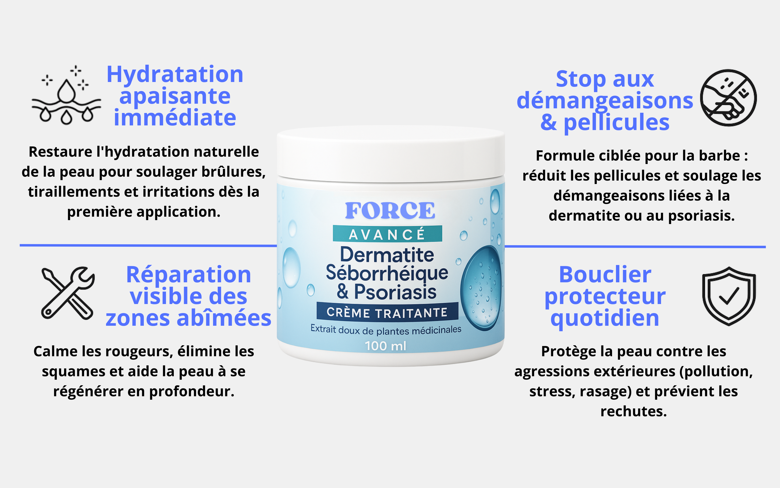 Oui. ForceSkin™ est efficace sur toutes les zones affectées par les rougeurs, squames ou démangeaisons, y compris le cuir chevelu, la barbe et les sourcils.